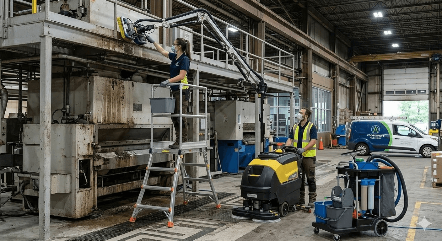 Entretien pour usines, ateliers et entrepôts avec équipements et normes de sécurité renforcées.