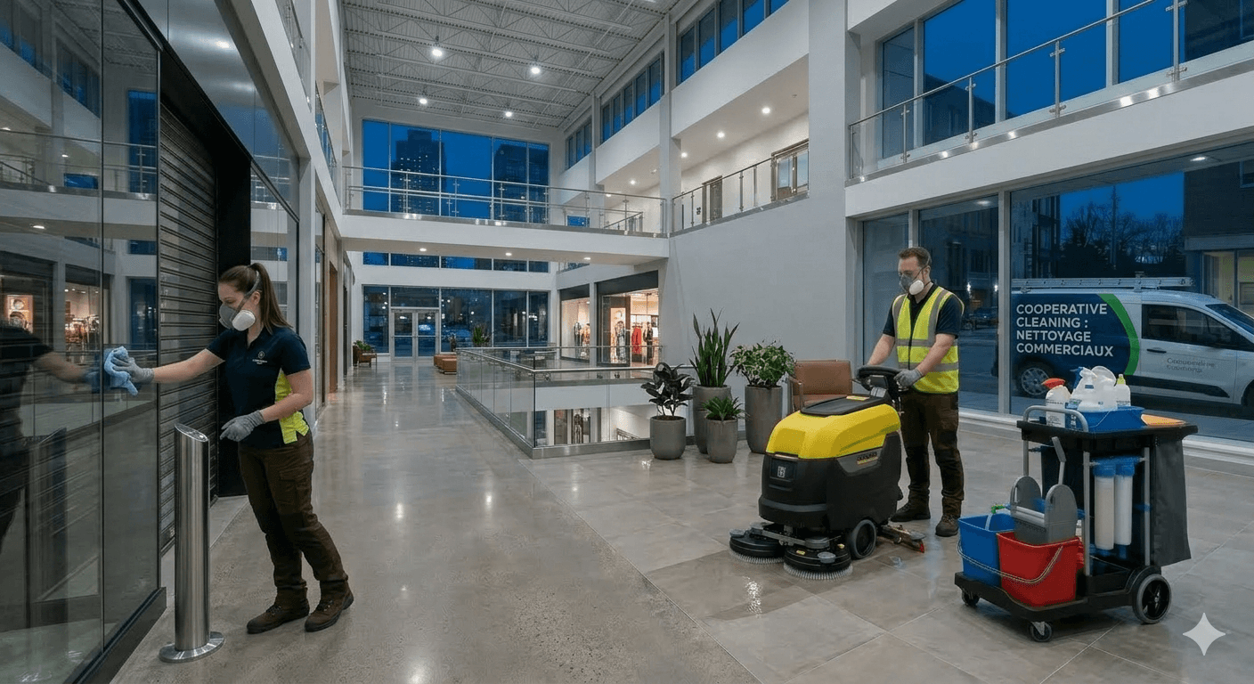 Nettoyage professionnel des espaces commerciaux, galeries et zones de passage à fort trafic.